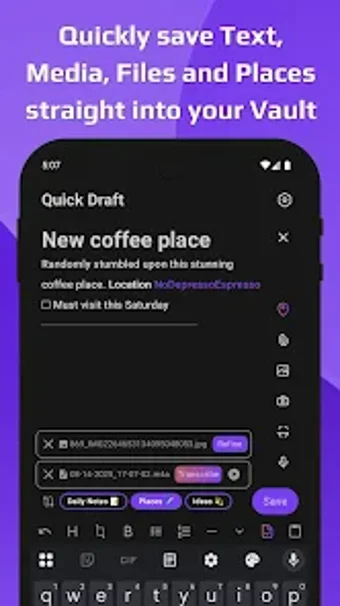 Quick Draft สำหรับ Obsidian เป็นแอปพลิเคชันการผลิตที่ออกแบบมาสำหรับผู้ใช้ Android ที่ต้องการวิธีการที่เรียบง่ายในการจับความคิดระหว่างเดินทาง แอปนี้มีอินเทอร์เฟซที่ปราศจากความยุ่งเหยิงซึ่งช่วยให้ผู้ใช้สามารถพิมพ์ พูด หรือจับความคิดได้ทันที โดยมีบันทึกไหลเข้าสู่ Obsidian โดยตรงเพื่อการจัดระเบียบในภายหลัง ฟีเจอร์หลักประกอบด้วยบันทึกไม่จำกัด การสนับสนุนสำหรับการแนบสื่อหลายประเภท ความช่วยเหลือจาก AI และการบันทึกเสียงพร้อมความสามารถในการถอดความ ผู้ใช้ยังสามารถแปลงข้อความจากภาพเป็น Markdown และบันทึกตำแหน่งได้อย่างง่ายดาย ทำให้เป็นเครื่องมือที่หลากหลายสำหรับการจับความคิดอย่างรวดเร็ว